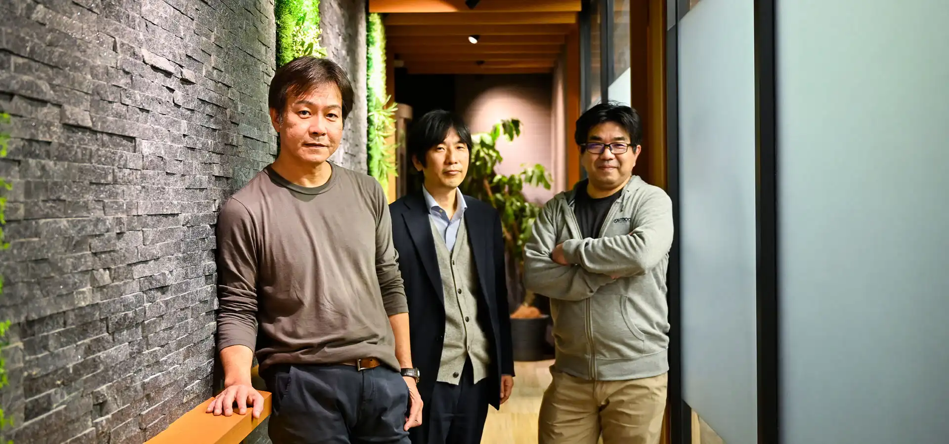 写真:創業メンバー(八田、埜村、根岸)2004年 3月