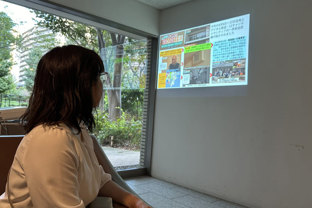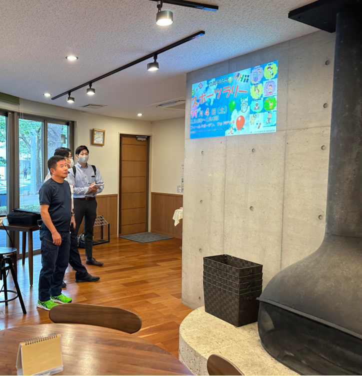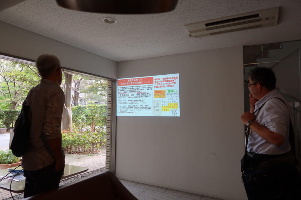 自治会は人々のコミュニティをつなぐ活動、たとえば「お祭り」や「文化祭」「音楽イベント」の運営も行っているため、いつでも情報を発信できるデジタルサイネージは、活動を支える重要なツールとなっています。Wi-fiに接続しているので管理者のパソコンでコンテンツをアツプするとリアルタイムで更新ができます。イベントが終了したら翌日には投影停止を自宅のパソコンから操作が出来るのも便利です。掲示板の場合、イベントが過ぎても掲示されたままのポスターを見かけますが、デジタルサイネージは投影場所に行かずに改廃できるのもメリットです。