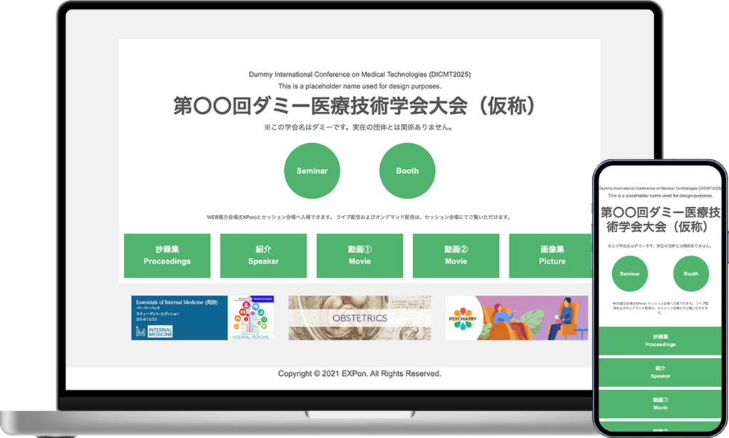 学会・展示会のテーマや目的に応じて、ロゴ・配色・レイアウト・コンテンツ配置を自由にカスタマイズできます。