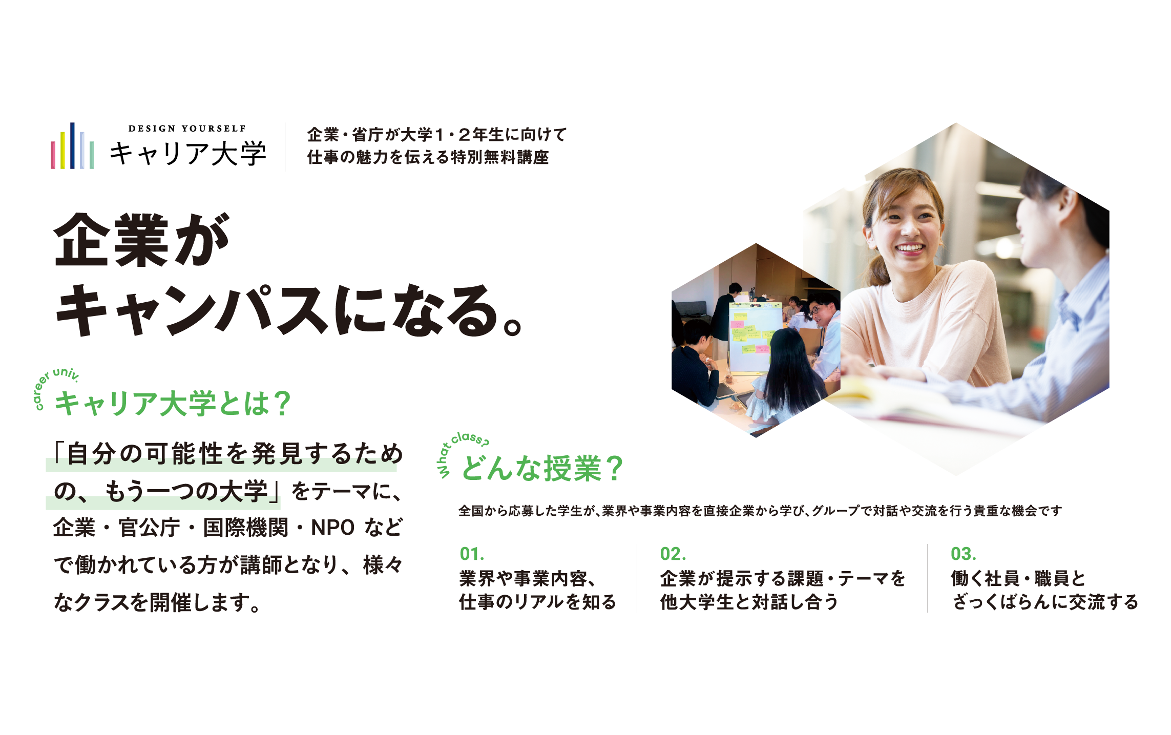 多様な学生と企業を結びつけ、採用の質を向上させるとともに、大学生・大学院生向けの無料会員制コミュニティスペース「plugin lab(プラグインラボ)」や、大学1・2年生を対象に行う特別授業企画「キャリア大学」なども展開しています。