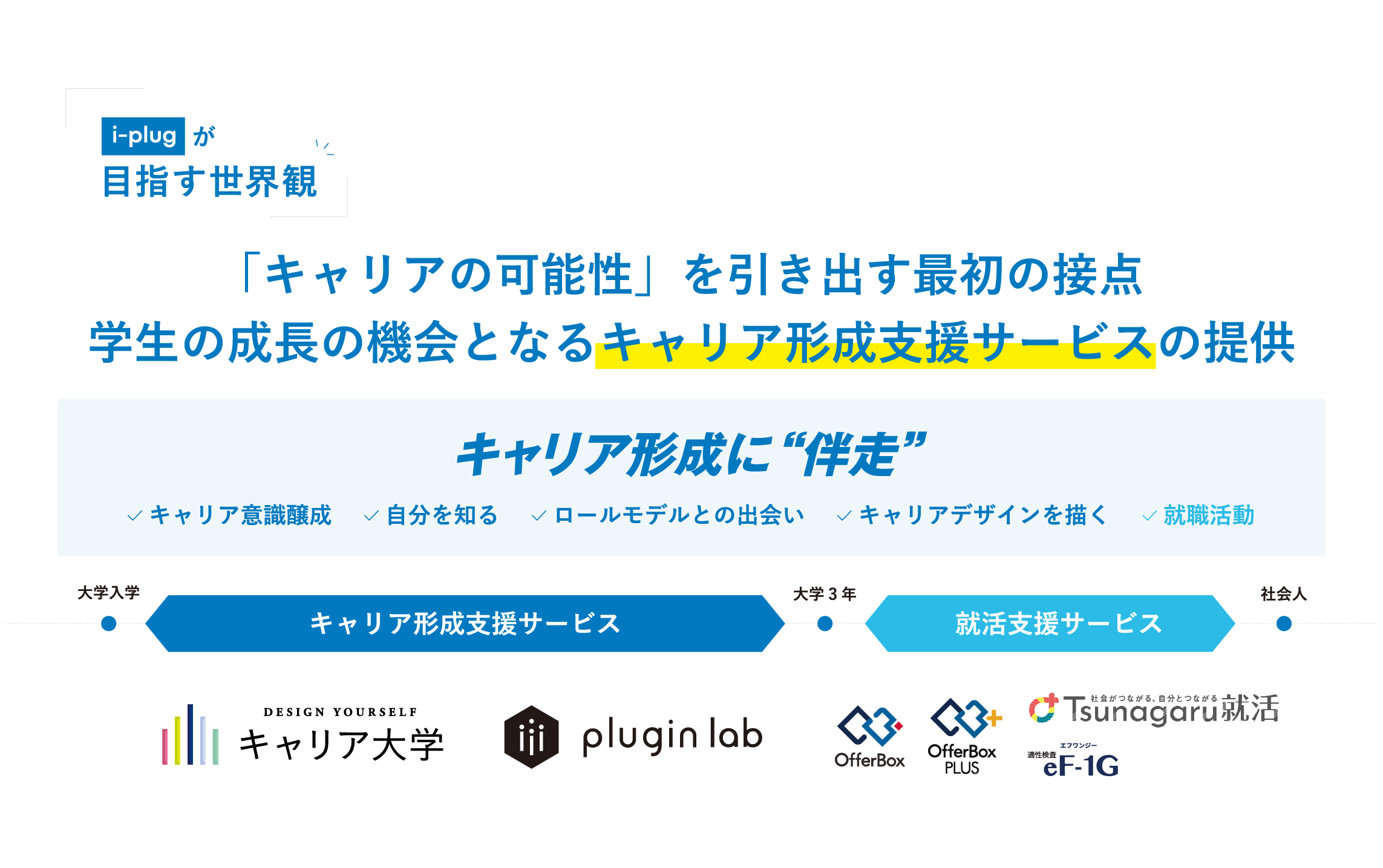 株式会社i-plugは、新卒オファー型就活サービス「OfferBox」を運営し、これまで多くの学生のキャリア形成をサポートしてきました。サービス開始から10年を迎え、キャリア支援のさらなる発展を目指し、新たな取り組みを始めています。現在「plugin lab」という店舗事業や「キャリア大学」などの関連事業の拡大を進めています。学生のキャリア形成や成長をサポートする環境を提供し、企業と学生の「つながり」を基盤に、企業と学生が本音で話し合える場の提供を目指しています。